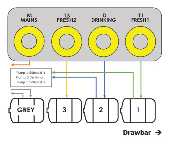 Tank 1 is located nearest to the draw bar. Tank 1 and Tank 3 provide water for use in the Vanity bason, Shower and Kitchen sink.